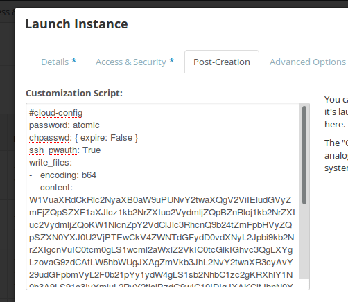 This same chunk of text can be used with platforms that do support cloud-init, as well. For instance, on OpenStack, I pasted the text above into the Customization Script field of the Post-Creation tab within OpenStack dashboard Launch Instance dialog: